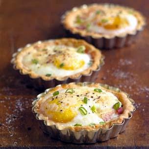 Line the bottom of each tart shell with 3/4 oz. ham and sprinkle with 1 tsp. green onions. Crack an egg into the center, pour 1 tsp. cream over the egg and sprinkle with 2 tsp. cheese. Bake until the whites are set and the yolks are cooked, about 15 minutes.