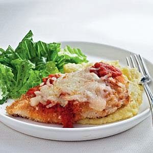 3. Heat 1 tablespoon oil in a large ovenproof skillet over medium-high heat. Add chicken to pan; cook 2 minutes. Add remaining 1 tablespoon oil. Turn chicken over; cook 2 minutes. Coat chicken with cooking spray; place pan in oven. Bake at 450° for 5 minutes. Turn chicken over; top each breast half with 2 tablespoons sauce, 2 tablespoons Parmigiano-Reggiano, and 3 tablespoons mozzarella. Bake 6 minutes or until chicken is done.