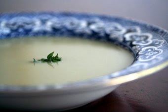 3 Remove and discard the herbs. Purée the soup and pass it through a fine strainer. When ready to serve, heat the soup and whisk in the remaining butter and the cream. Season with salt if needed and serve.