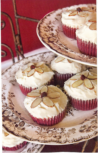 7. Frost cooled cupcakes with Cream-Cheese Icing. Garnish with sliced almonds and reserved crumbs.