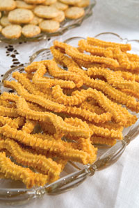 Place cheese mixture in a hand-crank cookie press fitted with the star plate. Press out long strips onto parchment-lined cookie sheets.