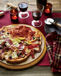 Spread the remaining 1/4 cup of marinara over the dough, leaving a 1/2-inch border. Arrange the remaining artichoke hearts, mozzarella, ham and salami over the marinara. Spoon small dollops of ricotta over the toppings, then scatter the mushrooms and olives on top. Sprinkle with the remaining oregano.