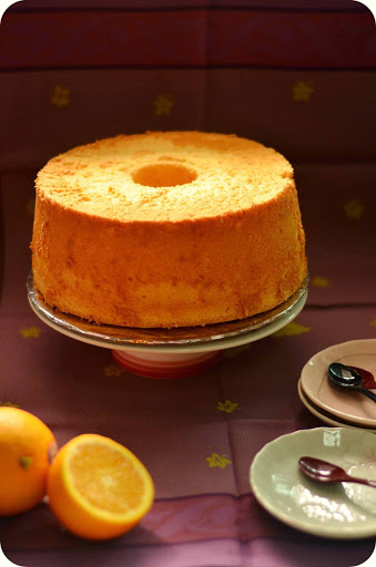 12. Bake in a preheated 180 degrees celcius (350F) for about 1 hr 5 minutes (+/-). The top of the cake should be lightly browned and springs back to touch when it is done. The cake tester inserted into the centre of the cake should come out clean. At about 25 minutes into the baking, check on your chiffon cake. If the top starts to get too brown or starts cracking too much, cover the chiffon cake with a sheet of aluminum foil (oil it so that the cake would not stick to it) before you continue with the baking.