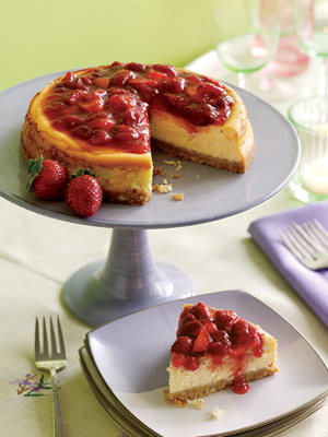 5. As soon as cheesecake is baked, spread with warm topping, leaving a border around edge. Run a thin knife between pan and cake; cool to room temperature. Chill at least 2 hours, or until serving.