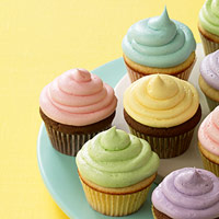 4. Beat butter, sugar, milk and vanilla on low speed to blend, then on high speed for 2 minutes, until good spreading consistency. Divide frosting into bowls and tint to desired colors. Transfer frosting to plastic bags and snip off one corner. Pipe in swirled pattern onto cooled cupcakes.