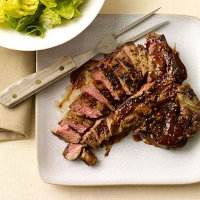2. In a small bowl, combine chili sauce or ketchup, sugar, garlic, Worcestershire sauce, mustard and ginger. Brush sauce all over the steak. Grill, flipping once, brushing steak with any leftover barbeque sauce while steak cooks, about 6 to 7 minutes per side, or until desired degree of doneness.
