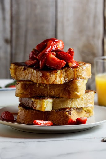 When the French toast is cooked, serve with the strawberries and a drizzle of maple syrup.