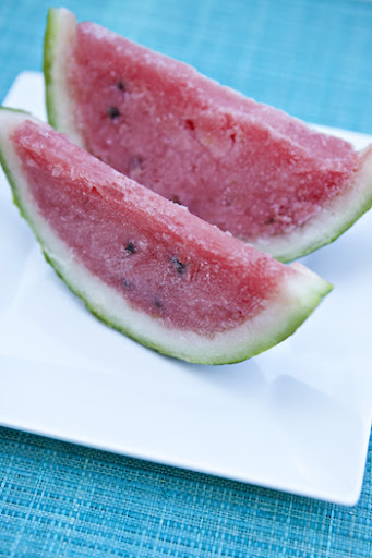 A sweet and tangy watermelon lime sorbet is a great way to cool off in the summer. As a bonus, this recipe is frozen back in the watermelon rind and cut off into slices. As a variation you can add chocolate chips to simulate seeds and give it a little extra sweetness.