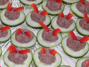 Scoop pate onto cucumber rounds and top with cherry tomatoes and onion slices for decoration. This recipe can also be served stuffed in a tomato, celery, cucumber boat or a pita pocket.