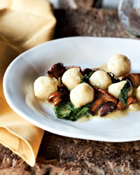 In a large pot of boiling salted water, boil the gnudi until tender and cooked through, about 6 minutes; drain. Add the gnudi to the skillet and stir gently to coat with the sauce. Cook over moderate heat for 2 minutes. Spoon the gnudi and sauce into bowls. Drizzle with oil, sprinkle with cheese and serve.