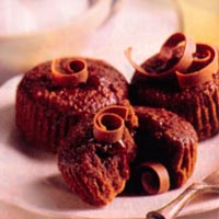 4. Bake in 325 degree F oven for about 12 minutes or until sides of cupcakes are set but centers are still liquid. Cool cupcakes in pan for 5 to 10 minutes. Centers will set into warm mousse. Garnish with chocolate curls, if desired. Peel off the cupcake papers carefully.