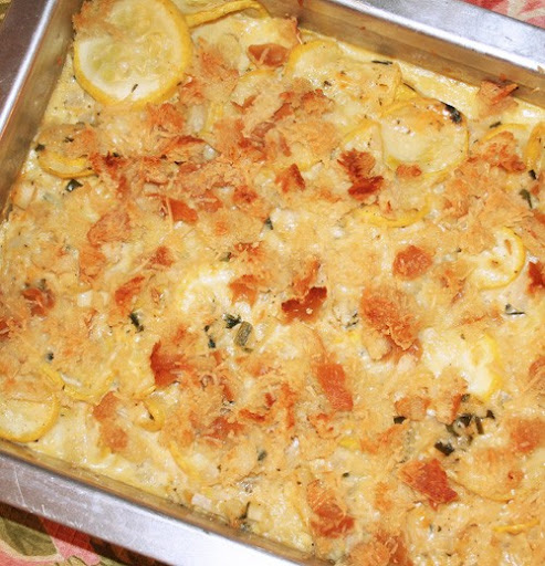 In large skillet, cook squash, covered in boiling water, for 8-10 minutes or until tender. Drain well and remove squash from skillet; gently press squash between paper towels to take out remaining moisture and set aside. Then, in same large skillet, melt 2 Tbsp. butter over medium-high heat; add onion and garlic, and saute 5 to 6 minutes or until tender. Remove skillet from heat; stir in squash, 1 cup breadcrumbs, 3/4 cup Parmesan cheese, and the other remaining ingredients, except for the garlic salt. Spoon into a lightly greased 13×9-inch baking dish.