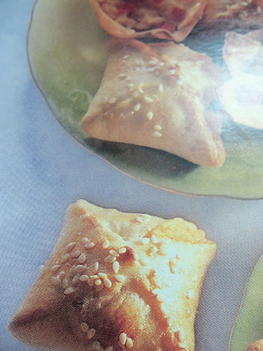 Heat oven to 425. Spray cookie sheet w/ nonstick spray. Unroll dough; roll or pat into 12" square. Cut into sixteen 3" squares. In small bowl, combine cheese and bacon; mix well. Spoon scant tsp. cheese mixture onto center of each dough square. Pull 4 corners of dough together; twist firmly. Pinch edges firmly to seal. Place on spray-coated cookie sheet. In small bowl, combine egg white and water; mix well. Brush egg white mixture over dough; sprinkle w/ sesame seed. Bake at 425 for 9-13 mins. or till edges of crust are golden brown.
