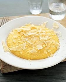 Gradually add the cornmeal in a steady slow stream and begin stirring until evenly thickened. I like using a whisk for the initial stirring to keep lumps from forming. As the polenta thickens, reduce heat to low and continue stirring - I switch to a wooden spoon at this point – Keep stirring for about 30 minutes. The cornmeal will swell and soften as it absorbs the hot water, and the longer you stir, the softer and creamier the polenta becomes...but be careful!…there's a certain stage where the polenta starts sputtering and can actually spit out at you...and it is HOT! (while you are stirring, you can wear oven mitts for protection) You will know the polenta is ready when it becomes a soft, creamy, yet compact mass that will actually pull away cleanly from the side of your pot. Stir in butter.