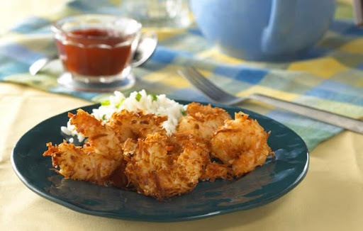 2. Dip the shrimp into the batter, allowing any excess batter to drip back into the dish. Dip into the coconut, pressing to adhere if needed.