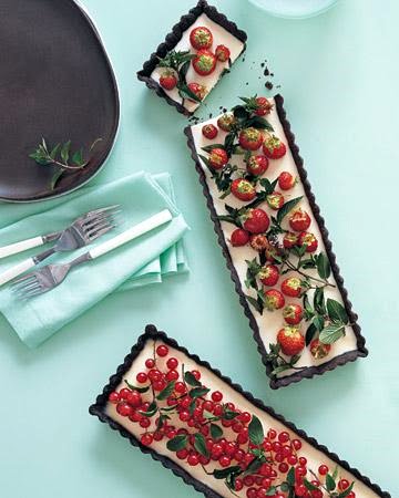 Carefully unmold tarts. Top 1 tart with red currants and 1 with strawberries. Garnish both tarts with mint stems. Slice and serve immediately.