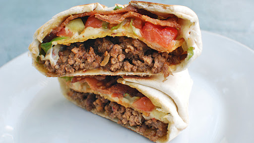 Break the crunchy taco shells in half and top with an ounce of cheese each. Bake a short time, just long enough to melt the cheese and brown the shell. Remove from oven. Lay out the soft tortillas and add in the taco mixture. Top with the cheese-covered crunchy shell, folding the corners that stick out so they don’t pierce the tortilla. Top with lettuce, tomato and bacon. Wrap the edges of the tortilla over to the top of the pile, forming 5 flaps that meet at the top.