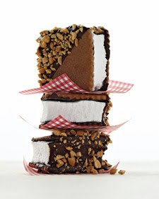 4. Cut out nine 2 1/2-inch square marshmallows using a cookie cutter or a knife dipped in confectioners' sugar. Dip surface of crackers into chocolate to coat, and transfer to parchment-lined baking sheets. Refrigerate until set, about 10 minutes. Sandwich marshmallows between crackers, chocolate sides in.