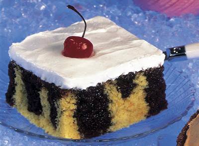* HOT FUDGE VARIATION: Bake and poke holes in cake as directed above. Place open jar HERSHEY'S Chocolate Shoppe Fudge Topping (Hot Fudge flavors) in microwave oven; heat as directed on label. Carefully spread fudge topping on cake; proceed as directed above.