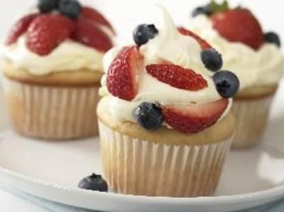 Prepare cake batter as directed on package for reduced fat cupcakes. Spoon evenly into 24 paper lined medium muffin cups. Bake as directed on package. Cool 10 minutes and remove from pans to wire racks. Cool completely. Pour milk into large bowl. Add dry pudding mix and beat with wire whisk 2 minutes or until well blended. Gently stir in whipped topping. Spread tops of cupcakes with pudding mixture. Arrange 5 of strawberry slices on top of each cupcake to resemble a star. Fill centers of stars with blueberries. Store in refrigerator.