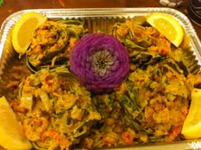 Steam artichokes in 2 tablespoons lemon juice, 2 tablespoons olive oil, 2 cups water, 1 teaspoon salt and 2 ounces of Italian dressing until leaves are tender and pull out easily. Saute green onions, garlic and Bell pepper in butter until tender. Add flour to mixture and stir continuously to coat vegetables. Do not let mixture stick. Cook for two minutes over a medium heat. Add parsley and stir. Add wine and cook for two minutes. Add Cajun seasoning, lemon juice and cream. Stir. Add the crawfish, Tasso, salt and pepper, Pickapeppa sauce and cayenne and simmer for two minutes on low heat. Remove the inner leaves and clean artichoke to the heart. Spread the leaves and fill the middle and the outer leaves with the stuffing.