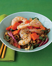 To serve, divide noodles and shrimp evenly among four large bowls; top each serving with remaining papaya, peanuts, garlic chips, and cilantro.
