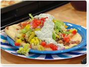 Pile the chicken onto the naan and top with the fixins and tzatziki sauce.