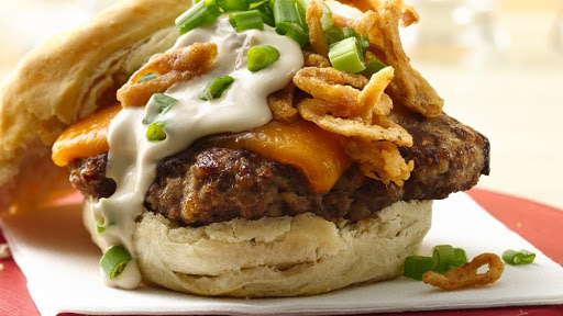 Grands! biscuits make a tasty bun for these rich, oniony burgers.