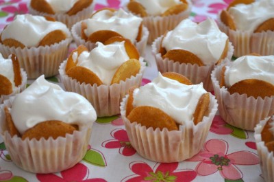 Place 18 cupcake papers into two - 12 cup muffin tins with cupcake papers. Place about four slices of banana in each cup.