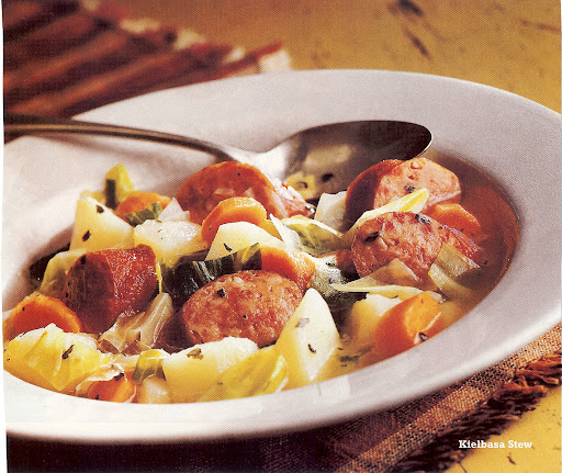 1. In a 4- to 5-quart slow cooker combine cabbage, potato, and carrots. Place kielbasa on top of vegetables. sprinkle basil, thyme, and pepper over kielbasa. Pour chicken broth over all.