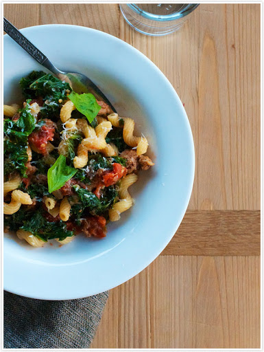 In a 12 inch to 14 inch saute pan, heat oil and onion over medium heat until just softened, about five to seven minutes. Add crumbled sausage and cook until lightly brown. Drain grease from pan and add tomato sauce and kale. Cover pan and simmer for 15 minutes. Meanwhile, cook pasta 1-2 mins short of al dente, drain and add to the sausage mixture. Toss to mix well and serve immediately. Drizzle with some best quality new season's oil.