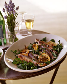 Prepare a stove-top griddle or outdoor grill. Rinse the arugula, shaking off any excess water. Arrange on a large platter and set aside.