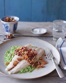 Baked barramundi goes dinner-party fancy with a salsa of raisins and toasted pecans. And that creamy-looking broccoli bed it's sitting on? A virtuous 100 percent dairy-free. This meaty but lean newcomer contains half the calories of salmon. And if you buy fish that has been farmed in this country, you don't have to worry about mercury. If you can't find it, try striped bass in this recipe instead.
