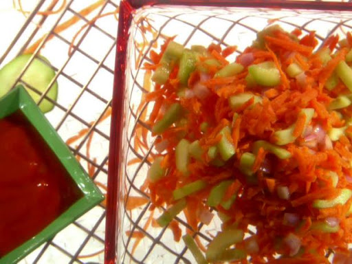 Halve and thinly slice the cucumber. Then place into a medium bowl with the grated carrots and shallots. In a small bowl, mix together the vinegar, Sriracha and soy sauce. Toss with the vegetables and season with salt and pepper only if needed. Serve.