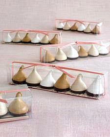 At the end of the reception, send guests on their way with sweet kisses. Along with traditional meringues, we included some flavored with coffee and chocolate; as a finishing touch, their bases are dipped in bittersweet chocolate. Package in clear plastic boxes lined with patterned paper and tied with ribbon in a matching color.