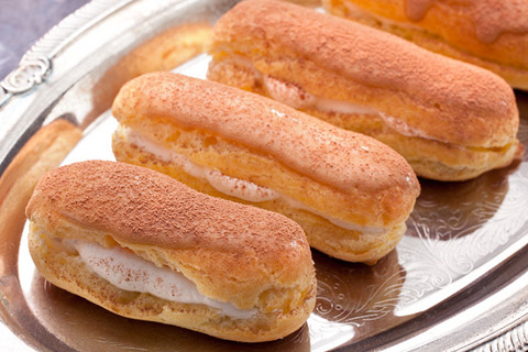 For these tiramisu-inspired mini éclairs, we use a classic choux pastry, but instead of the traditional pastry cream filling, we use mascarpone cheese and sweet Marsala wine whipped together with cream. The pastries are topped with an espresso glaze, and after a final dusting of cocoa powder, these bite-sized treats have all the flavors of Italian tiramisu in a classic French pastry bite.