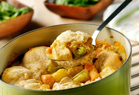 The slow-cooker simmers chicken, potatoes, carrots, and celery in a creamy sauce, topped with tender dumplings made easy and delicious with baking mix.