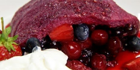 4. Remove berries from the heat and cool slightly. Using a slotted spoon, spoon the fruit into the bread-lined bowl, top with a final layer of bread and spoon a bit more of the juices over the top to colour the top layer of bread evenly. Reserve the remaining cooking juices for serving.