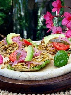 Mezclar 100 gramos de achiote con 3 tazas de jugo de naranja y ½ taza de vinagre. Marinar con esta salsa la pechuga deshebrada por un lapso de 4 horas; posteriormente freír con poca manteca de puerco.