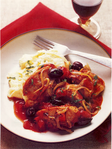 3. Add onion to pan; saute 3 minutes, or until golden. Add garlic; cook 30 seconds until fragrant. Add tomatoes, olives and chicken, stirring to scrape up brown bits on bottom of pan. Cover and cook 4 minutes, or until chicken is cooked.