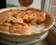 Bake the peaches for 10 minutes, then remove, drop the topping dough over the peach slices (it will spread). Sprinkle sliced almonds over the dough, and bake the cobbler 45-55 minutes, until the top is browned and the filling bubbling.