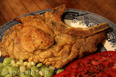 Oil is ready when it shimmers. Dredge pork chops in the flour mixture, shake off excess and carefully slide pork chops in the skillet, cooking in batches, 2 to 3 at a time, depending on size. Don't overcrowd the skillet.