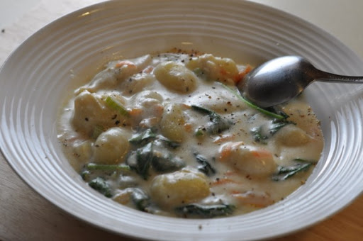 Saute the onion, celery, and garlic in the butter and olive oil over medium heat until the onion becomes translucent. Add the flour and make a roux. Let the butter and flour mixture cook for about a minute before adding 1 quart of half and half. Cook gnocchi according to package directions. Into the roux, add in the carrots and chicken. Once the mixture becomes thick, add the chicken broth. Once the mixture thickens again, add the cooked gnocchi, spinach, and seasoning; simmer until soup is heated through. Before serving season to taste by adding additional salt.