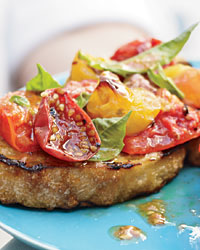 Set the packets on the grill and cover. Grill over moderately high heat for about 18 minutes, until the tomatoes begin to soften and burst. Using scissors, carefully cut open the foil packets and serve.