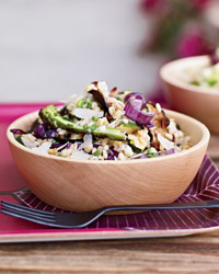 Cut the grilled vegetables into bite-size pieces and add to the barley. Add the walnut dressing, lemon juice and chives and season with salt and pepper. Garnish with the shaved pecorino cheese and serve warm.