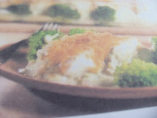 Place cooked broccoli into 9 x 13 pan. Top w/ fish, sprinkle w/ paprika. Mix soup and milk, pour over fish. Sprinkle w/ cheese. Stir the bread crumbs w/ butter. Sprinkle over top, bake at 350 for 45 mins. or till fish is flaking when tested w/ fork.