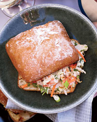 On a work surface, chop the shrimp and scallions. Transfer to a large bowl and add the sambal mayonnaise, cabbage, water chestnuts, cilantro and carrot; season lightly with salt and pepper. Mound the shrimp salad on the ciabatta rolls, close the sandwiches and serve.