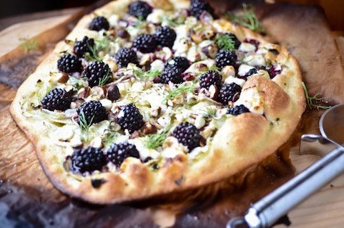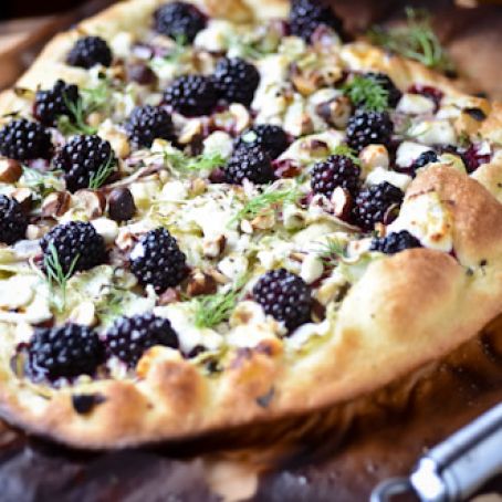 Shape the dough into a round shape trying to get it as thin as possible without tearing it. Lightly drizzle the dough with a teaspoon of olive oil and top with the blackberries, fennel and goat cheese. Sprinkle the thyme and hazelnuts over the top and bake until the crust is crispy and the cheese is melted 8 to 12 minutes. Sprinkle with the reserved fennel fronds and drizzle with honey. Let stand for a few minutes before slicing and serve while still hot.