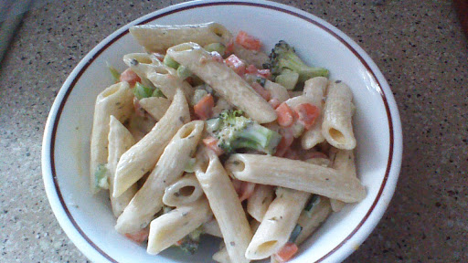 Combine all ingredients in a bowl, preferably several hours before serving. Pasta should be slightly undercooked and mixture should be quite 'sloppy' (unless serving right away), as the excess moisture will be absorbed as it sits.