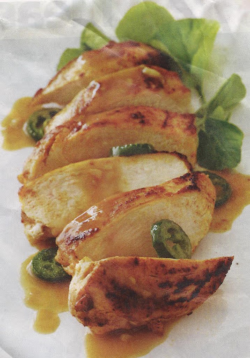 1. In medium saucepan, saute jalapeno and garlic in 2 tsp oil until golden, 4 minutes. Add wine andreduce until almost evaporated. Add lemon juice and stock, and bring to a simmer.